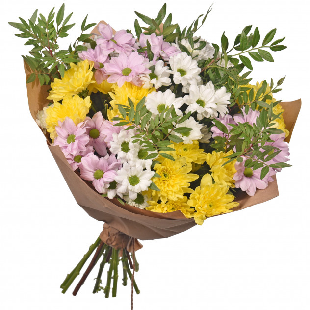Упаковка для букета: крафт-бумага, Фисташка 3шт., Хризантема кустовая 11шт.