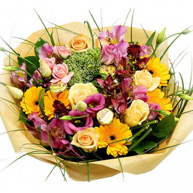 Лизиантус 3шт., Роза кремовая 60 см 5шт., Гербера 5шт., Упаковка для букета: натуральная сетка-джут, Альстромерия 3шт., Берграсс, Салал 5шт., Конфеты шоколадные 5шт.