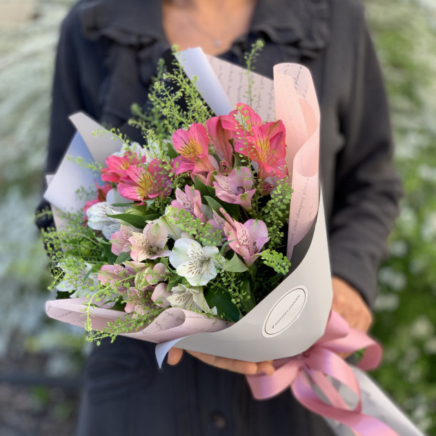 Букет с разноцветной альстромерией и грин белл, в дизайнерской упаковке.